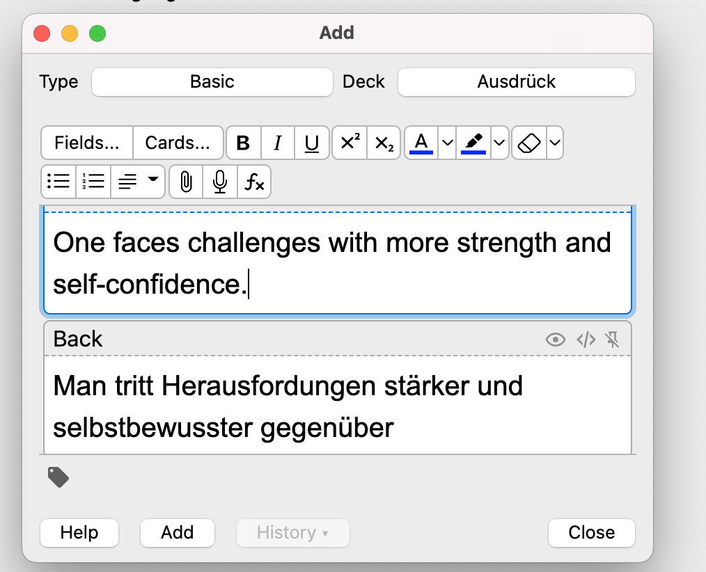 Open Anki, create a deck, press add. The front will be your language, and the back will be German